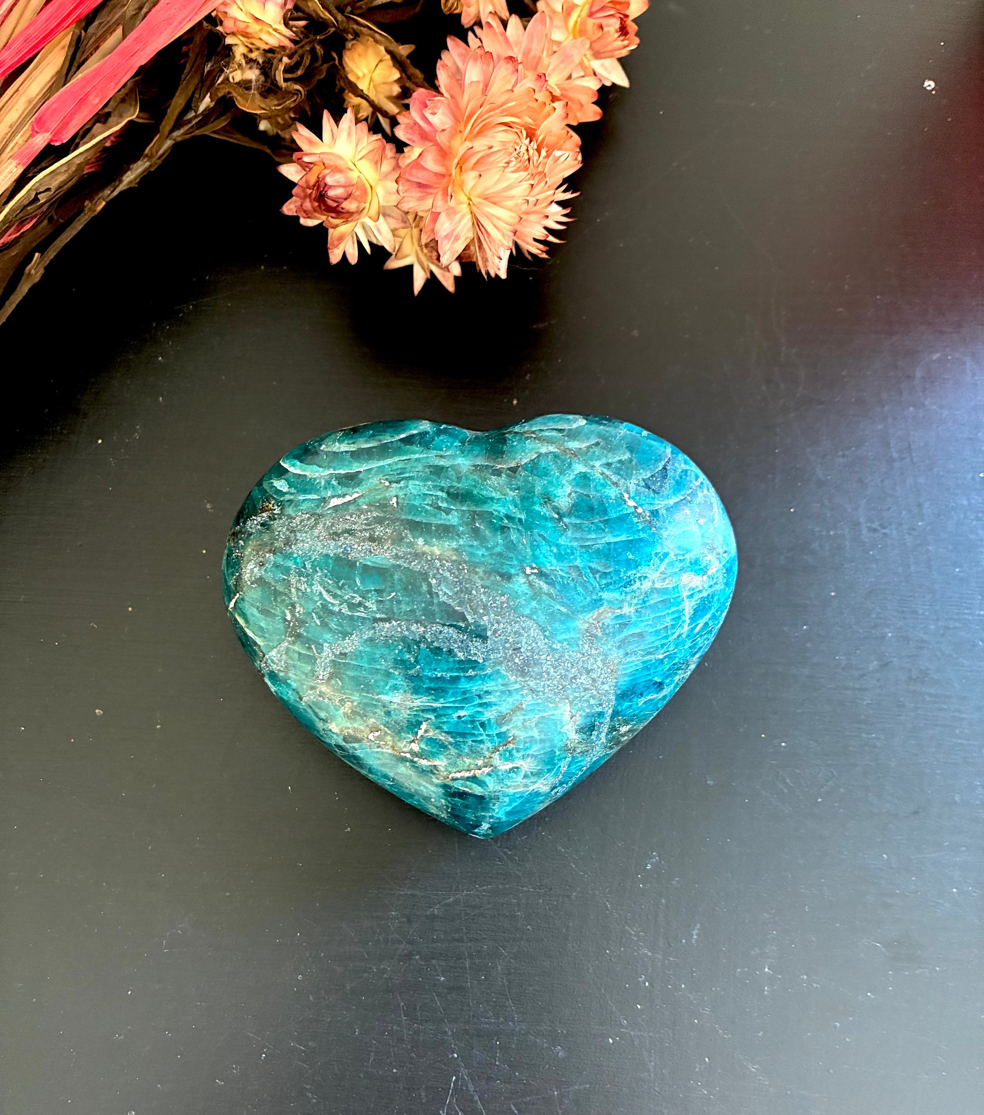 L’apatite bleue est une pierre de lune : rechargez-la а la pleine lune ou en la déposant sur un amas de quartz ou une druse d’améthyste pendant 24 heures.