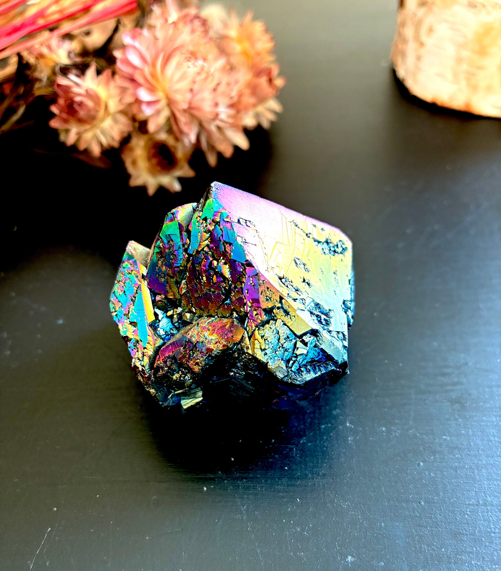 Il s’agit d’un Quartz naturel qui a reçu un traitement à base d’or et de titane. Ce processus a pour but d’augmenter et de décupler le taux vibratoire du quartz initial. Le Quartz Aura permets aux minéraux de développer leurs énergies à très haute fréquence spirituelle/vibratoire.